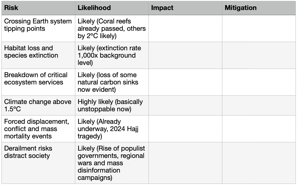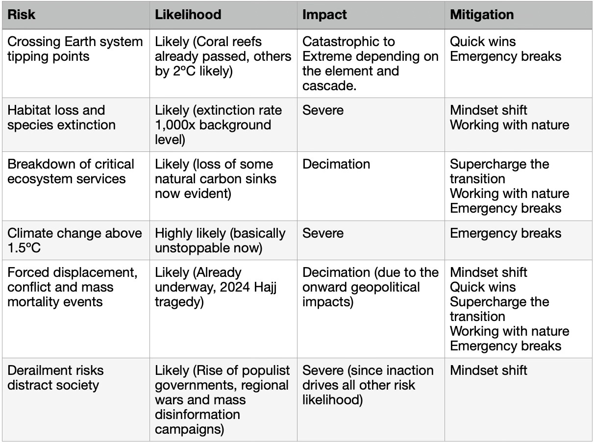 Insurers and risk managers set appetite levels for risks. They analyse the risk position and trajectory and highlight not only the level of risk but also the action required to mitigate it. The same approach is required for climate and nature. The report identified six key risks that should be well outside the risk appetite for humanity: