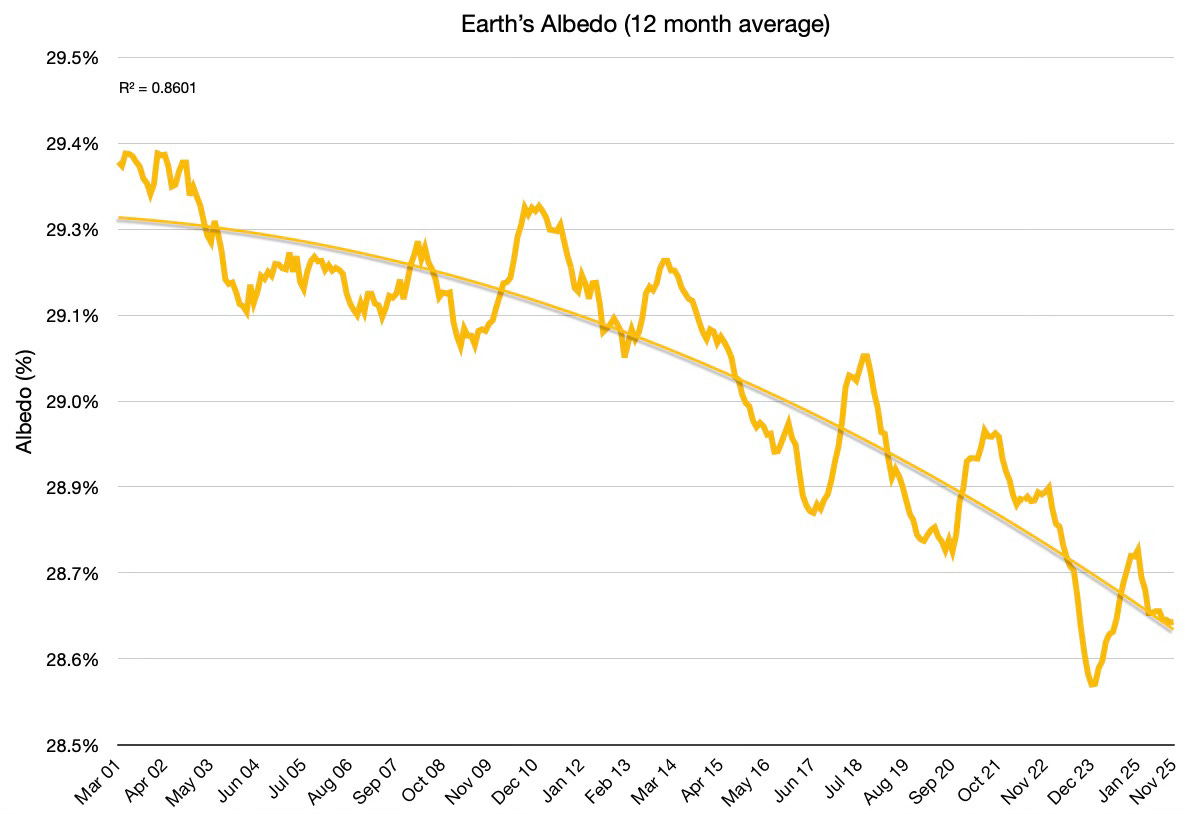 This is not a small task. Prof Eliot Jacobsen recently calculated that to replace the full loss of albedo so far this century would require a line of high efficiency mirrors wrapped around the whole equator 130 km wide! Obviously implausible but it does highlight the scale of the albedo loss, which continues to drop, raising the EEI.