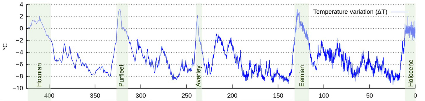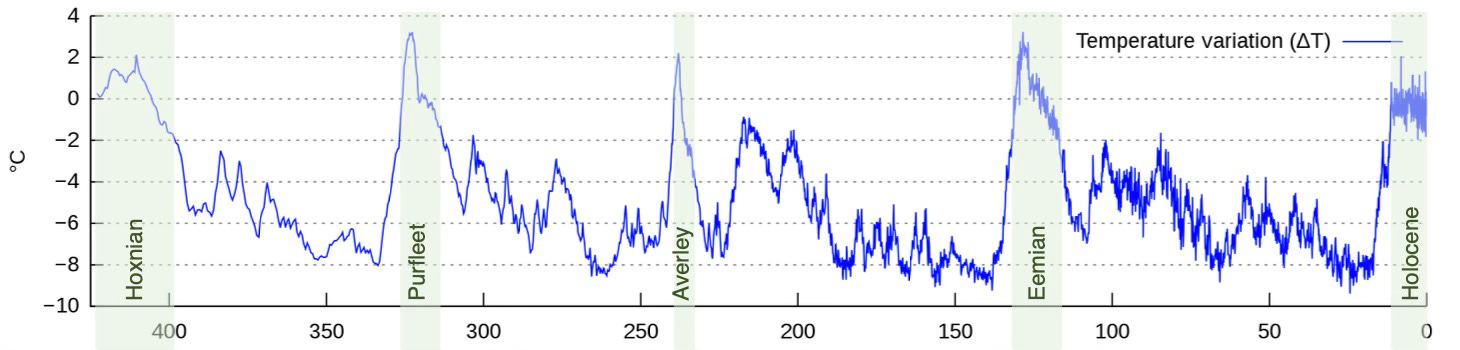 The Hoxnian was just over 400,000 years ago. It was an unusual interglacial in that it was very long lived, but with temperatures about the same as they are today (averaging at 1.5ºC above pre-industrial). This provides a clue as to how Greenland might react to the temperature regime we are driving it into.