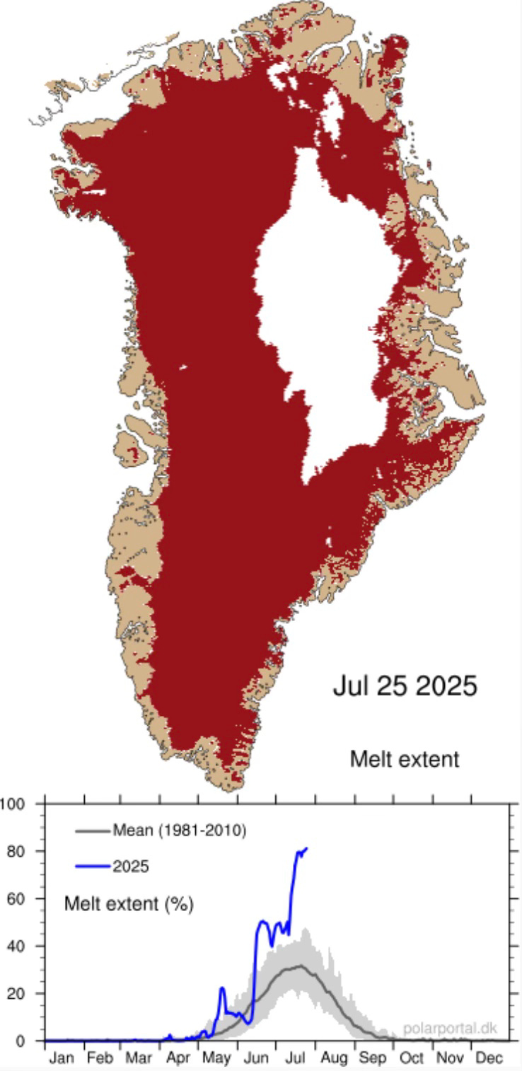 Although not a record breaker, the 2024/25 melt season was still extreme. A melt spike in mid-July saw over 80% of the ice sheet surface melting simultaneously. In addition, unusual late season melting continued into September. These late-season melting events are becoming more common, lengthening the melt season and increasing ice loss. The figure below shows the daily melt extent anomaly. Red areas indicate surface melting during the melting spike of July 2025.