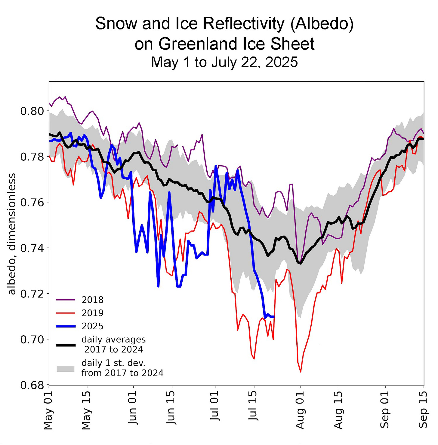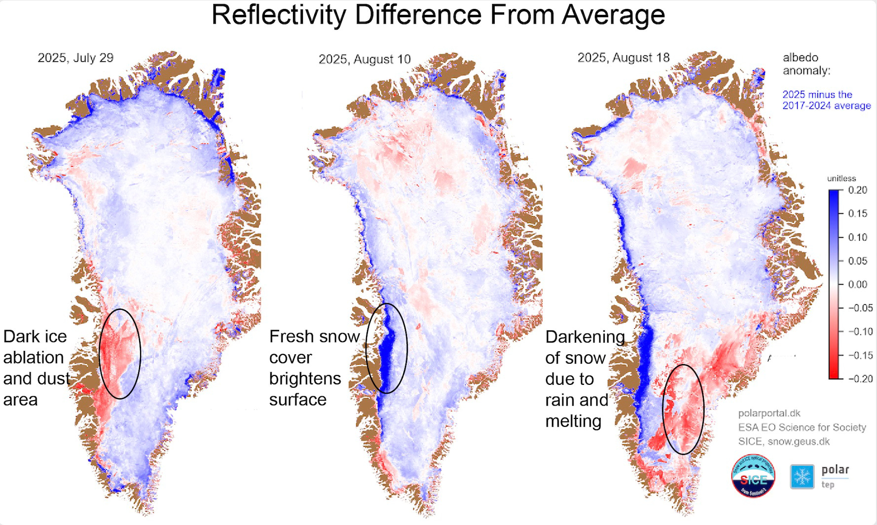 Black carbon and soot from forest fires, especially in northern Canada often settles on the ice surface and decreases the albedo. Algae growth on the surface also darkens it. This allows more heat to melt the surface rather than be reflected back out into space. The figure below shows the sequence from late July to mid August 2025 and the effect of snowfall on Albedo.
