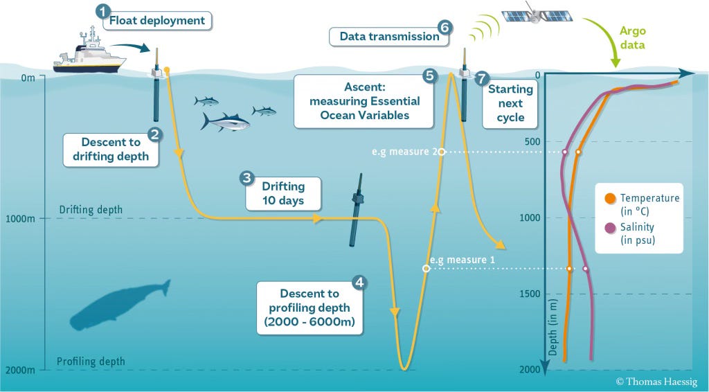 When it comes to data analysis A.I. has a great deal to offer in climate science. ARGO is a good example of how A.I. is being used to interpret it’s data. The ARGO programme is a 30 country collaborative effort to collect data from the oceans using autonomous floats. Over 2,000 of these floats are scattered around the world. Each float (costing up to $185,000) runs continual missions after being launched from a ship. It first sinks to a depth of 1,000m then drifts on the currents for 10 days. It then descends further to between 2,000 and 6,000m before ascending again taking measurements of the water column. These typically include temperature and salinity profiles but can also include biogeochemistry, oxygen saturation, pH and nitrate levels. Once on the surface they relay the data by satellite before diving again for another run, repeating the process for up to 10 years. The fleet provides 13,000 profiles every month from all over the globe. The data is free to access and has been used in over 6,000 scientific publications and referred to or used in over 500 PhD theses.
